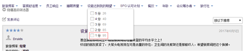 挖掘細節,我們發現:設施老化是非常重要的影響因素。在SPG官網點評的315位顧客中,評1分的人最多,達到95位;3分以下的達到180位,占比57.14%。
