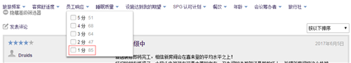 另外,員工的響應也是廣受詬病的。在SPG官網點評的315位顧客中,同樣是評1分的最多,達到85位;3分以下的達到132位,占比41.9%。