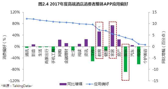 對于高端酒店經(jīng)營者而言,僅圍繞消費者已產(chǎn)生的消費需求進行服務(wù)展開是遠遠不夠的。通過對高端酒店消費者APP應(yīng)用偏好進行分析,可以幫助酒店更有效地進行針對性營銷,從而擴大目標(biāo)消費群體。從2017年前三個季度高端酒店消費者的整體APP應(yīng)用類型上來看,通訊、影音和生活是其主要使用的三大類APP。但就增長率而言,教育、家居類型的APP在2017年的使用頻率明顯提升,增長幅度超過5個百分點,而娛樂型APP的偏好度則出現(xiàn)大幅下滑。