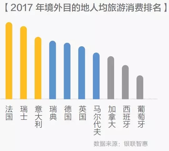 數據顯示,法國、瑞士、意大利、瑞典、德國、英國、馬爾代夫、加拿大、西班牙、葡萄牙的人均旅游消費最高。歐洲物價整體偏高是一方面原因,另一方面原因是歐洲游的購物消費也遠高于其他目的地。