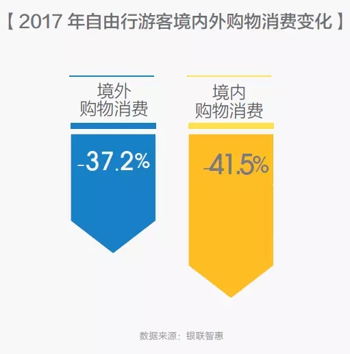 與2016年相比,2017年自由行游客的境內購物消費下降41.5%,境外購物消費下降37.2%。自由行游客選擇將減少的購物消費支出投入到體驗消費上,如美食、文化娛樂等。