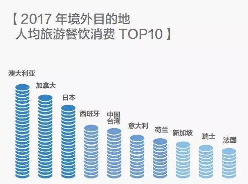 境外旅游餐飲人均消費最高的目的地是澳大利亞、加拿大和日本,澳洲牛排、日本壽司等美食的價格均相對較高。