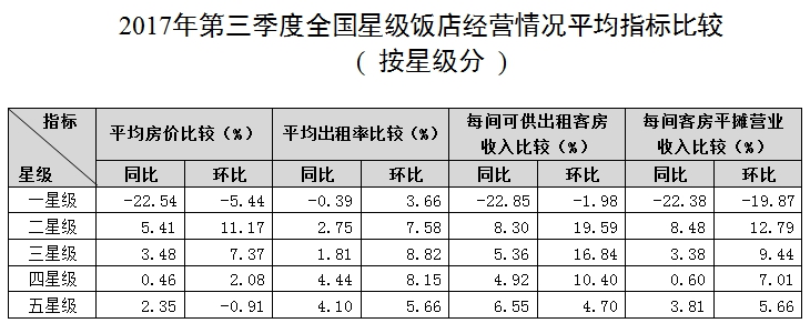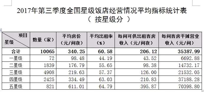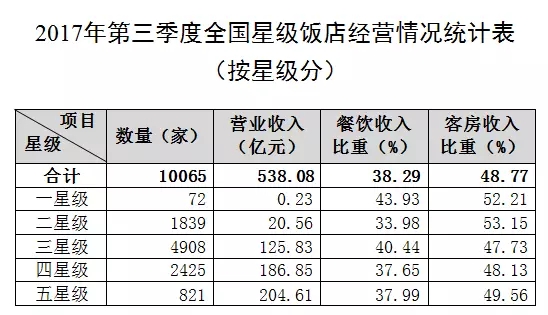 新聞來源:宏輝智通 發(fā)布日期:2018-01-22 瀏覽次數(shù):3128全國10065家星級飯店第三季度的營業(yè)收入合計538.08億元,其中客房收入為262.42億元,占營業(yè)收入的48.77%,平均房價為340.25元/間夜,平均出租率為60.58%。