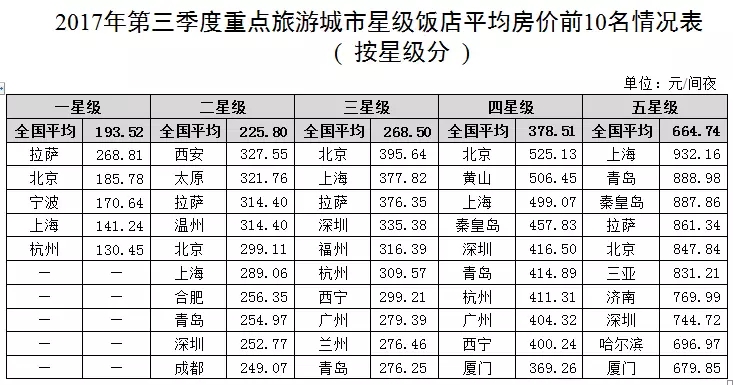 全國50個重點旅游城市共有3761家飯店通過第三季度數(shù)據(jù)審核,占全國總數(shù)的37.37%。其中,五星級飯店575家,占全國五星級飯店總數(shù)的70.04%,四星級飯店1108家,占全國四星級飯店總數(shù)的45.69%,三星級飯店1601家,占全國三星級飯店總數(shù)的32.62%,二星級飯店470家,占全國二星級飯店總數(shù)的25.56%,一星級飯店7家,占全國一星級飯店總數(shù)的9.72%。