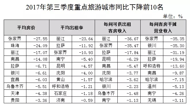 平均出租率:增幅位居前10位的城市為珠海、杭州、??凇⑷齺?、西安、西寧、武漢、太原、天津、南昌,其中珠海增幅最大,為31.03%;降幅位居前10位的城市為麗江、拉薩、張家界、南寧、昆明、沈陽、黃山、呼和浩特、石家莊、濟(jì)南,其中麗江降幅最大,為23.64%。
