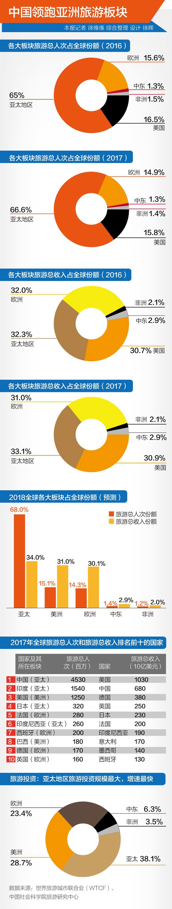 2018年或成為國際旅游巨頭在中國市場的爆發年。由世界旅游城市聯合會(WTCF)與中國社會科學院旅游研究中心聯合發布的《世界旅游經濟趨勢報告(2018)》顯示,全球旅游格局中,2017年與2016年相比,歐洲份額縮小,美洲保持穩定,亞太持續擴張。其中2017年中國以45.3億人次的旅游總人次和6800億美元的旅游總收入分列全球第一和第二。