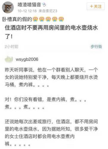這兩天,一則微博網帖在網上頗受網友關注:“昨天聽同事說,他在一個群看別人聊天,一個女的說她特別愛干凈,每天晚上都要燒開水燙馬桶、煮內褲。……對!你們沒有看錯,是煮內褲!還說她每次出差或旅行,住酒店,都不用房間里的電水壺燒水,因為據她所知,很多愛干凈的女士住酒店時都會用電水壺煮內褲!