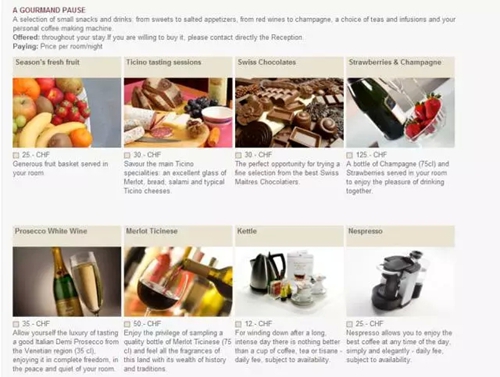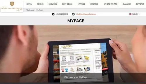 位于瑞士Lugano的四星級Dante酒店讓客人在入住的前三天之內可利用網絡check in,同時提供給客人My Page定制化服務的機會。Lugano Dante提供150種不同的服務,包括mini bar的飲料、報紙、枕頭、毛毯等等免費服務。另外,客人也可以購買巧克力、香檳或船票等等。有幼齡小孩的家庭,家長可以事先預訂嬰幼兒需要的用品,這些貼心的服務頗受好評。