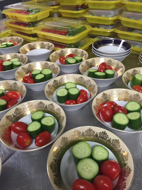 菜單確定后,酒店餐飲部各司其職,進入緊張的工作狀態。9月3日定制食材,9月4日進行食品加工制作。在時間緊迫的情況下,卻又突生小狀況,酒店于9月4日下午1時臨時接到沙方消息,原定于5日下午5時左右從杭州蕭山機場起飛的航班,臨時調整至5日上午10時30分,這對酒店來說意味著又減少了近7小時的制作時間。為了能順利完成此次任務,酒店召集了廚房部門所有同事,60余人進行通力協作,8小時的不眠不休,終于在5日凌晨1時將1104份航空餐全部打包裝箱進入運輸車,在機場指定時間內保質保量將航空餐送達機場。
