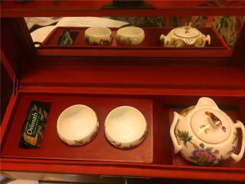 青島香格里拉除了高端酒店配有的瓷器外,還有一個紅盒子裝著Dilmah茶葉和茶具,茶包可以帶走,茶具不能帶走哦
