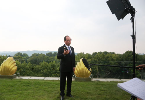 2016年9月4日下午2點10分,法國總統(tǒng)弗朗索瓦•奧朗德在索菲特會所酒廊戶外露臺接走媒體采訪。