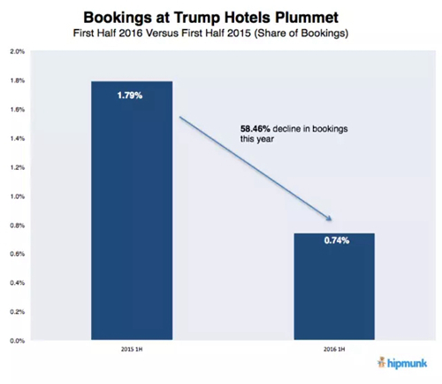據美國旅游搜索網站Hipmunk統計,2016年上半年全美的特朗普酒店預訂數量的市場份額同比減少58%,可以說是暴跌。該網站的用戶多為城市地區的年輕人,似乎在特意避開特朗普品牌。