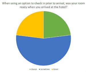 23%使用移動端辦理入住的旅客表示,他們“從來沒有”發(fā)現(xiàn)到達(dá)后客房可立即入住。54%的客人表示客房“有時(shí)”是已經(jīng)準(zhǔn)備好可隨時(shí)入住的。