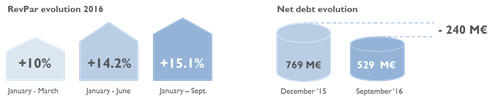 2、第三季度的強勁勢頭、十月業務的出色表現以及第四季度的預訂讓集團維持了2016年每間客房可用收益預計增長在中上程度的范圍內(80%歸功于價格的調節改善)