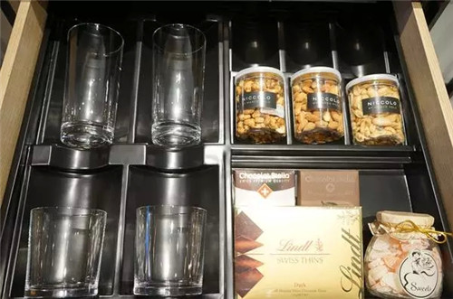 minibar不是迷你的酒吧。從一個小冰箱開始,里面有水(最基本的,還要看品牌和種類)、果汁、軟飲、酒類、糖果等。延伸到吧臺柜面上和各個抽屜里,典藏一些酒店精選特色飲料小食,還配備了時下流行的膠囊咖啡機,各色茶包,各類咖啡杯碟和酒杯等。