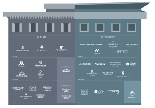 下圖是萬豪對其30個(gè)酒店品牌、度假村俱樂部和長住品牌的分類: