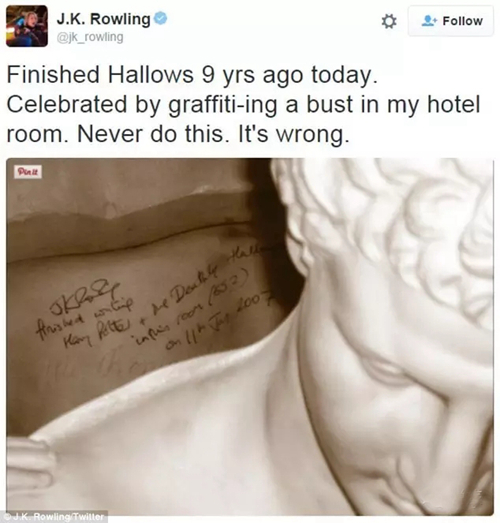 羅琳紀(jì)念創(chuàng)作完結(jié)的方式也很獨(dú)特,她在房間里的赫爾墨斯(希臘神話中的人物)雕像的背后偷偷寫下了“在2007年1月11號(hào),J.K. 羅琳在552房間完成了《哈利波特與死亡圣器》”。這個(gè)原本面對(duì)房間的雕塑現(xiàn)在也被反方向放置,就是了能夠讓大家都看到這句話。