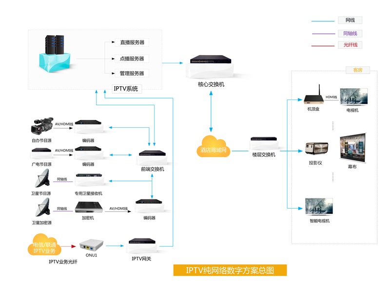 ? 頭端設(shè)備:天線、衛(wèi)星接收器、編碼器、數(shù)字接收機等,用于接收直播電視信號源,其中天線,衛(wèi)星接收器,有線電視信號等信號源和接收裝置需要酒店預(yù)先準備。
