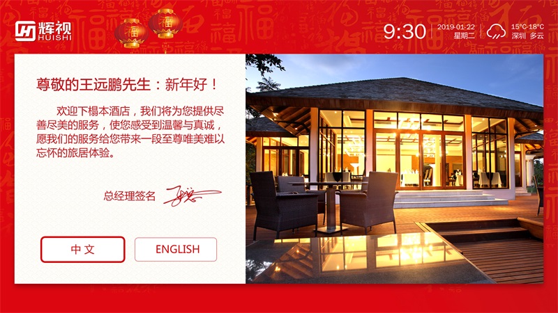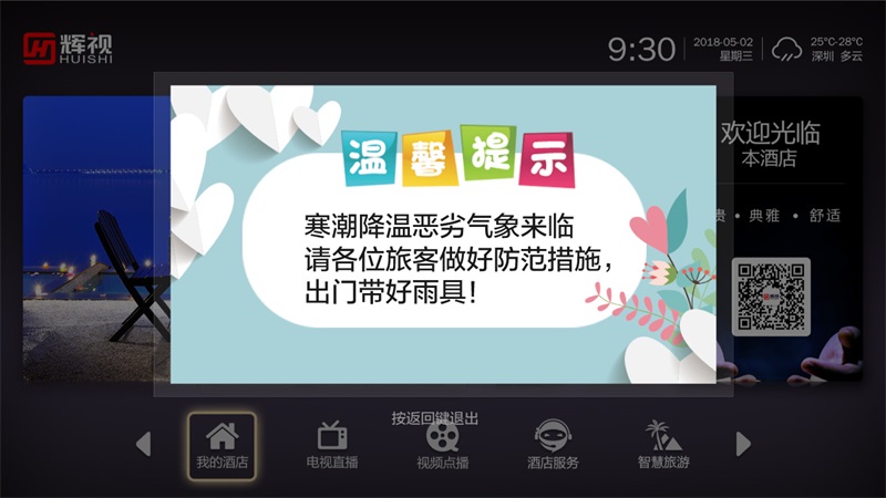 節(jié)日祝福:系統(tǒng)與酒店管理系統(tǒng)(PMS)等進行無縫對接,通過TV終端自動為客人送來溫馨節(jié)日/生日/紀念日文字祝福,同時自動場景界面換膚,附加動畫渲染效果,讓客人倍感溫馨的關(guān)懷、賓客如歸的感覺