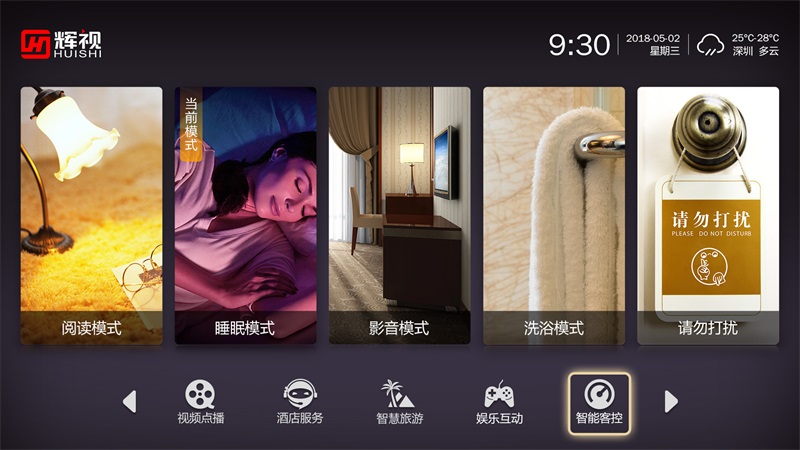 智能客控:酒店智能客控,聰明你的酒店。智能客控系統(tǒng)只需使用遙控器就可實現(xiàn)燈光、窗簾、電視、空調(diào)、音樂服務(wù)控制。