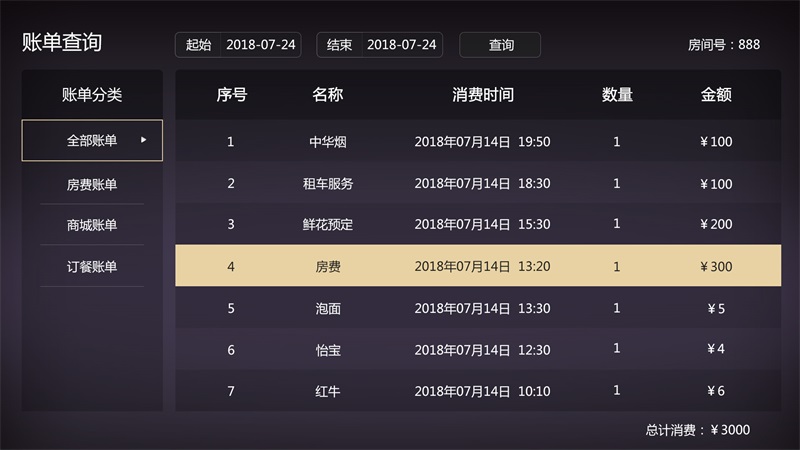 綜合查詢:系統(tǒng)對用戶本次入駐所有消費記錄清單記錄查詢,包括房費、餐費、購物、娛樂項目及費用查詢;